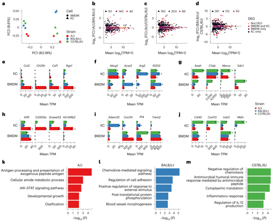 (a) BMDM 和 Kupffer 细胞的 RNA-seq 数据的整体主成分分析。 (b-d) Kupffer 细胞的 RNA-seq 数据的平均 TPM 和 DeSeq2 log 2 (差异倍数) (e-j) BMDM和 Kupffer 细胞中代表性基因的表达。 (k-m) GO分析。