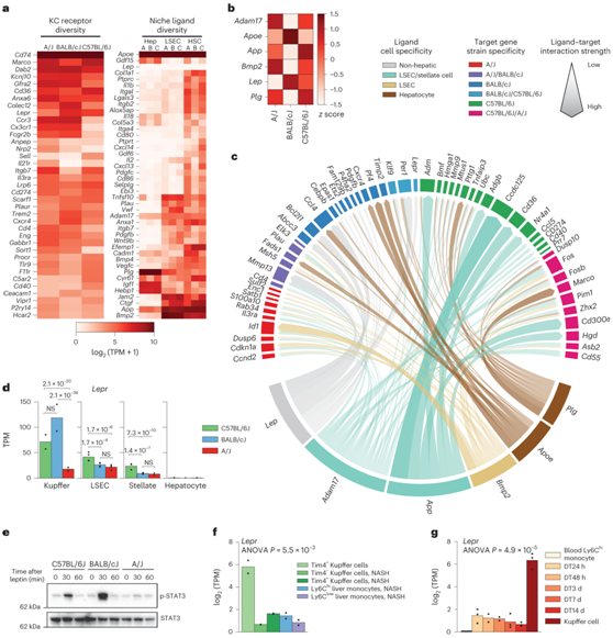 (a) Kupffer 细胞(左)的受体基因表达或来自指定细胞类型的生态位伴随细胞(右)的配体基因表达。 (b) 每个细胞系的最高 NicheNet 配体活性得分。(c) Circos 图展示了(b)中前 6 个 NicheNet 配体的基因靶标。 (d) 肝细胞中瘦素受体的品系特异性表达。(e)免疫印迹分析。(f) 编码瘦素受体的基因在健康C57BL/6J小鼠的Kupffer细胞(左)和骨髓细胞(包括从胰岛淀粉样蛋白肝NASH(AMLN)诱发NASH饮食20周的小鼠中分离的巨噬细胞和单核细胞)中的表达。(g) 编码瘦素受体的基因在胚胎来源的Kupffer 细胞(最右侧)和骨髓来源的单核细胞中的表达。