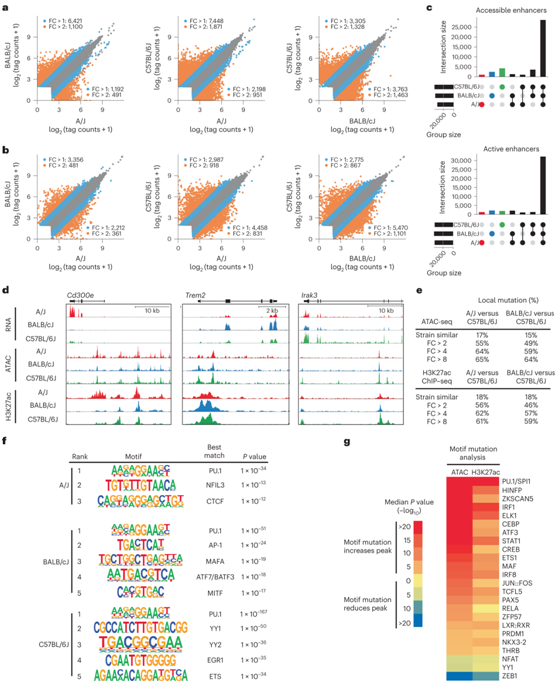 为了估计局部遗传变异对 ATAC-seq 和 H3K27ac 中品系特异性差异的影响程度,他们确定了与品系相似的 ATAC-seq 和 H3K27ac 峰处 ATAC 定义的开放染色质内 SNP 和插入缺失的频率ATAC-seq 或 H3K27ac 信号表现出大于两倍的变化。品系相似的峰表现出15-18%的背景SNP/插入缺失频率,而相差超过两倍的峰表现出46-56%的变异频率(图2e)。为了识别驱动品系特异性增强子选择的潜在转录因子,他们对品系特异性增强子进行了基序富集。在每种情况下,PU.1结合位点都是最富集的基序(图2f)。此外,假定的增强子在品系之间表现出优先的H3K27ac,包括富集了识别NFIL3、AP-1和ETS因子等的基序(图2f),并表明增强子活性和序列特异性转录因子之间可能存在因果关系。