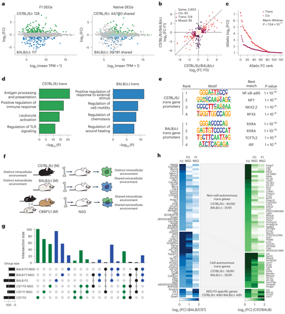 (a) F1 杂交小鼠中具有按品系着色的显著偏差基因的差异等位基因表达(左)或具有重叠的 F0 品系特异性基因的 F1 杂交小鼠中的等位基因表达(右)。 (b) 使用来自亲代小鼠的Kupffer 细胞(x轴)与来自F1小鼠的Kupffer 细胞(y轴)的基因表达比率的比较。 (c) 与顺式和反式基因相关的亲本系中等位基因差异倍数的累积分布。 (d) GO分析。(e) 与 BALB/cJ 或 C57BL/6J 特异性转基因相关的启动子中的 HOMER 从头基序富集。 (f) 实验示意图。 (g) UpSet图显示在亲本、F0-NSG移植和F1-NSG移植条件下BALB/cJ和C57BL/6J品系特异性基因的交叉。 (h) F1 和 NSG 模型中鉴定的转基因重叠。