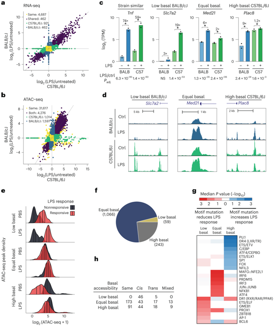 (a) C57BL/6J(x轴)和BALB/cJ(y轴)Kupffer细胞中LPS转录反应的比较。(b) C57BL/6J(x轴)和BALB/cJ(y轴)Kupffer细胞中对LPS的ATAC-seq反应比较。(c) 对LPS的品系相似和品系差异转录反应的例子。 (d) 与“低基础”、“等基础”和“高基础”基因相关的附近增强子处的 ATAC-seq 信号。 (e) “低基础”、“等基础”和“高基础”复合增强子中 ATAC-seq 信号的分布。(f) 每个基本可及性类别中的增强子数量。(g) MAGGIE基序突变分析,比较与每一类增强子相关的品系之间的基序得分。(h) 在从用LPS处理2小时的小鼠分离的CB6F1/J Kupffer细胞中进行顺式和反式增强子分析的三个增强子类别的重叠。