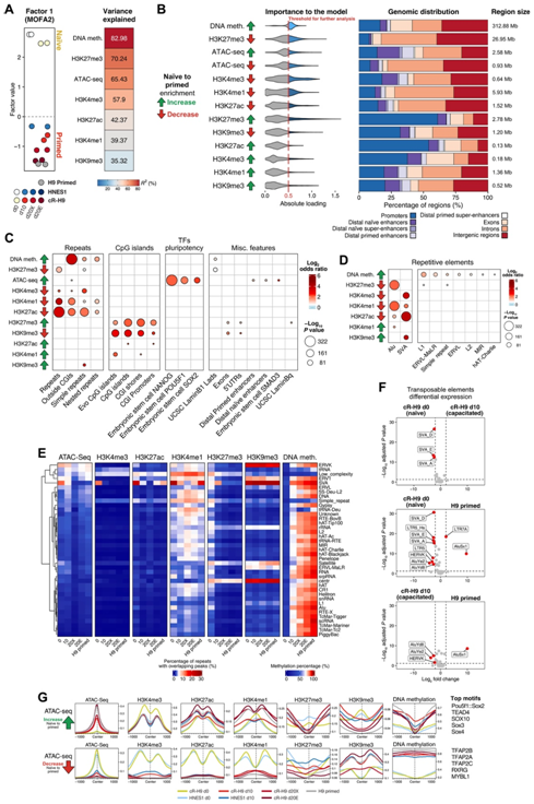 (A)组蛋白修饰的ChIP-seq、ATAC-seq差异峰中提取的因子1的MOFA2因子值,以及基于不同条件下甲基化百分比的顶部200个含cpg的可变区域。(B) 按模型加载权重排序的热门特征(表示为“对模型的重要性”)。(C)在注释的基因组区域上富集因子 1 中的顶部特征。(D) 因子 1 中的顶级特征比重复元素富集。(E) DNA 甲基化百分比以及 ATAC-seq 和 ChIP-seq 峰与重复元件重叠的百分比。(F)“cR-H9 d0”和“cR-H9 d10”细胞、“cR-H9 d10”和“H9 primed”细胞以及“cR-H9 d10”和“H9 primed”之间转座元件类别的差异表达。(G) 以 ATAC-seq 顶部峰为中心的区域的表观遗传图谱。