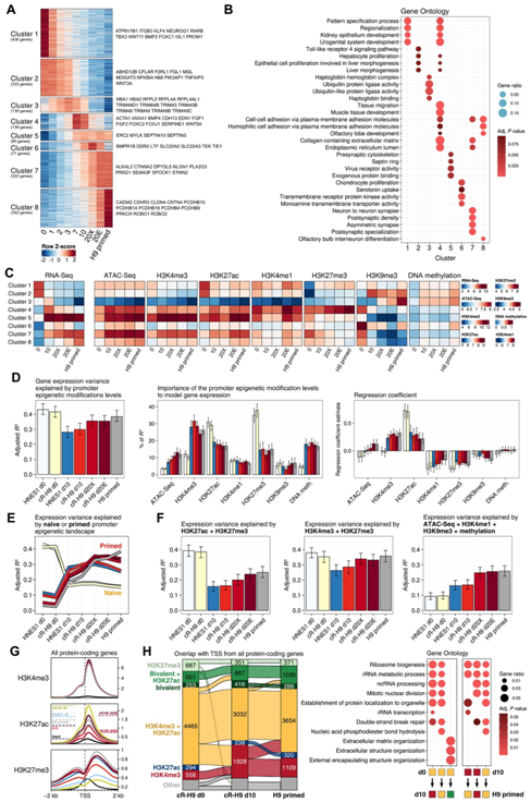 为了探索表观遗传修饰如何与基因表达相关,他们分析了 hPSC 中差异表达基因启动子的表观遗传动态(图 5A)。首先根据 RNA-seq 数据集中所有样本之间的差异表达基因定义了 8 个聚类。该聚类分析将基因分为在获能过程中具有不同动态的两个主要组:下调基因(聚类 1 和 2)和上调基因(聚类 3 至 8)。