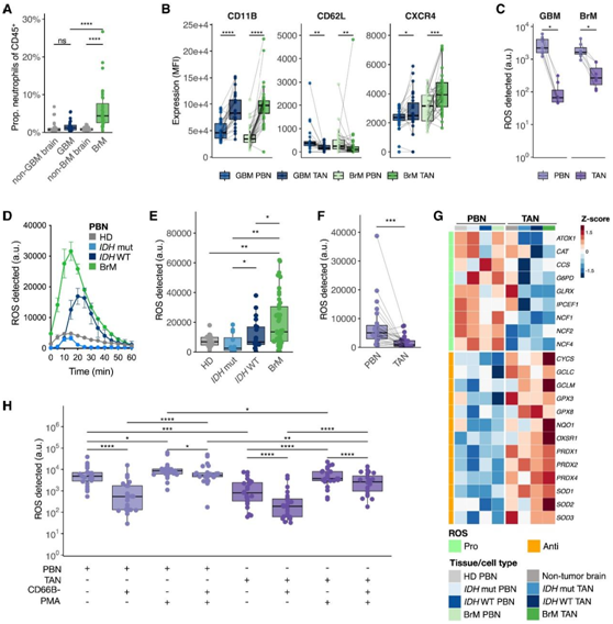 (A) ntv-a;iLy6GtdTomato胶质母细胞瘤(GBM)和iLy6GtdTomato BrM小鼠模型和非肿瘤小鼠脑中CD45+免疫细胞Ly6G+中性粒细胞比例。(B)指示标记的MFI。(C)在分离的pbn和TAN中检测到任意单位(a.u)的ROS。(D) HD和脑肿瘤患者外周血中ROS随时间变化的代表性曲线。(E) HD和荷瘤患者pbn中检测到的ROS水平。(F)匹配pbn和TAN中检测到的ROS。(G)热图显示了BrM和胶质瘤TAN与匹配PBN中ros相关的显著DEG。(H) pbn和TAN共培养中检测到的ROS。