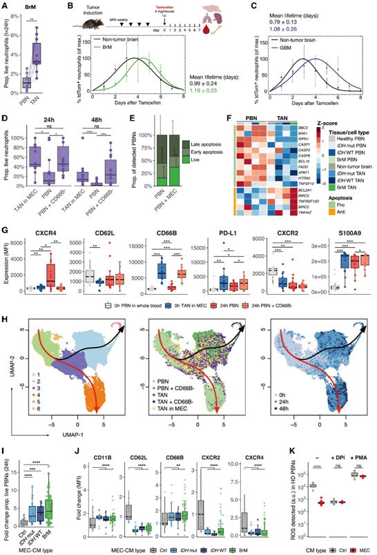 (A) 24 小时后基于膜联蛋白 V 活力染色的 BrM 小鼠中活中性粒细胞的比例。(B) 实验设计显示 iLy6G tdTomato小鼠和 tdTomato +中性粒细胞比例在 8 天内在非肿瘤和具有BrM 的小鼠大脑中标准化至最大值。(C) Ntv-a;iLy6G tdTomato非肿瘤和 GBM 小鼠脑中tdTomato +中性粒细胞的比例归一化至最大值。(D) 24 小时和 48 小时时肿瘤中活 TAN、匹配的 PBN 和与 CD66B– TME 群体共培养的 PBN 的比例。(E) 单独和与匹配的 MEC 共培养的不同活力阶段的 PBN 比例。(F) 与 PBN 与脑(肿瘤)组织中性粒细胞凋亡相关的 DEG 热图。(G) 随着时间的推移(0 和 24 小时)且存在 CD66B-TME,PBN 中表型标记物的 MFI。(H)UMAP可视化。(I) 在 MEC-CM 中培养后 HD PBN 24 小时存活的差异倍数。(J) 与对照培养基相比,在 MEC-CM中培养的 HD PBN中的 MFI 差异倍数。(K) ROS水平分析。