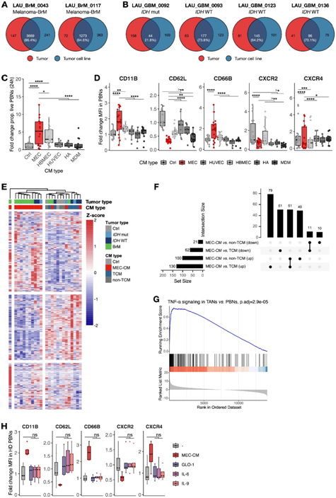 (A) 在匹配的 BrM MEC 和肿瘤细胞系中通过全外显子组测序 (WES) 鉴定的体细胞突变的维恩图。(B) 通过 WES 鉴定的IDH mut和IDH WT 神经胶质瘤匹配的 MEC 和肿瘤细胞系的体细胞突变的维恩图。(C)在肿瘤幼稚细胞系条件培养基(CM)中培养的HD PBN在 24 h存活率的差异倍数。(D)蛋白质表达的差异倍数。(E) 在脑肿瘤 MEC-CM、肿瘤细胞条件培养基 (TCM)、非 TCM 和对照培养基中检测到的蛋白质的无监督热图。(F) 神经胶质瘤和 BrM MEC-CM 与 TCM 和非 TCM 中差异检测的蛋白质的可视化。(G) 胶质瘤和 BrM TAN 中 TNF-α 信号通路的 GSEA 与匹配的 PBN 相比。(H) 在 MEC-CM 中培养或用 MEC-CM 特异性可溶性因子处理的 HD PBN中的标记物的差异倍数。