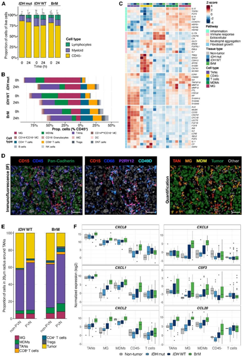 (A) 0、24 小时时离体MEC中活细胞的比例。(B) 免疫细胞群的平均比例为(A) 中所示培养物中CD45+ 细胞的百分比。(C) 主要 TME 群体中 MEC-CM 特异性上调蛋白的基因表达水平热图。(D) 肺 BrM 中 QuPath 的代表性 IF 图像和细胞类型定量。(E) BrM和IDH WT 神经胶质瘤中 TAN周围 20 μm 半径内识别的细胞类型的平均比例。(F)不同脑 TME 细胞群体中嗜中性粒细胞募集细胞因子的标准化 log2转化表达。