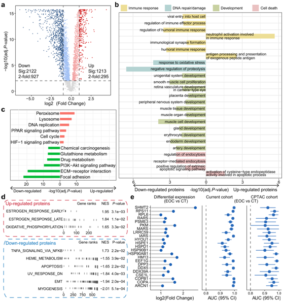 (a) 火山图显示肿瘤中蛋白质的上调或下调。 (b) 按不同类别着色的条形图显示了失调蛋白质的富集生物过程 (BP)。 (c) 富集 KEGG 通路的条形图,粉色条表示富含上调蛋白的通路,绿色条表示富含下调蛋白的通路。 (d) GSEA 结果显示在代表癌症特征的标记集背景下评估的特征。 (e) Lollipop图显示蛋白质的差异倍数,森林图显示这些蛋白质的曲线下面积 (AUC)。