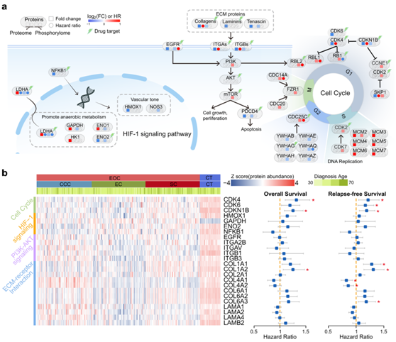 由于蛋白质组学分析揭示了几种信号通路的干扰,他们接下来试图从多组学的角度来阐明这种干扰。在这里,他们整合了先前发表的磷酸蛋白质组数据(CPTAC 队列)和磷酸蛋白质组分析确定的上述途径中这些蛋白质的失调磷酸位点。他们发现DNA复制途径中的蛋白质表现出整体上调模式,而失调的磷酸化位点在Gap 1期、Gap 2期和有丝分裂期表现出更复杂的模式。HIF-1 信号通路也富含上调的蛋白质,而这些蛋白质的磷酸化在 CPTAC 队列中受到抑制。此外,他们发现 ECM 受体和 PI3K-Akt 信号通路富含下调蛋白,磷酸位点也显示出下调模式(图3a)。