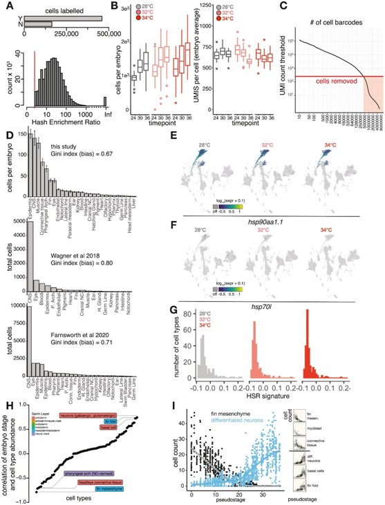 (A)条形图显示通过的单个细胞数量(Y:是;N:否)哈希富集比(最丰富的哈希相对于第二丰富的哈希的计数)阈值为3。(B) 箱线图显示每个胚胎中的细胞数量(左)和每个胚胎中每个细胞的 UMI 数量(右),按样本时间点划分并按温度处理着色。(C) Knee图显示UMI 计数(红线)的阈值。(D) 条形图显示斑马鱼全胚胎样本的另外两项scRNA-seq 研究中每个胚胎细胞计数的组织成分。(E) 标记图显示在 32°C 或 34°C 下没有诱导 hsp90aa1.1,包括所有时间点的细胞。(F) hsp70L 的标记图,hsp70L 是一种用于斑马鱼热休克转基因报告基因的基因。(G) 直方图显示在任何分析的温度下跨细胞类型的 HSR 没有系统性激活。(H) 每种细胞类型的点图,按该细胞类型丰度与全胚胎伪阶段之间的Pearson相关性排序。(I) (A) 中所示高度相关类型的两个示例,针对强负相关类型(鳍间充质)和强正相关类型(分化神经元)的胚胎阶段绘制原始细胞类型丰度数据;右侧插图显示了更多示例。