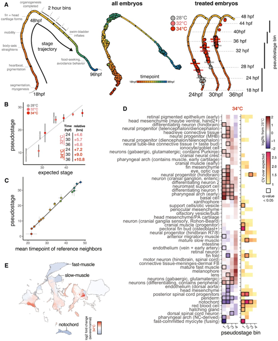 本项研究全动物scRNA-seq来表征温度应激下的数百个斑马鱼胚胎,以识别驱动表型变异的细胞类型和分子程序。温度扰乱了多种细胞类型的正常比例和基因表达程序,并且还引入了发育时间的异步性。脊索对温度特别敏感,将其映射到一种特殊的细胞类型:鞘细胞。这些细胞在高温下积累错误折叠的蛋白质,导致脊索的级联结构故障和解剖缺陷。本项研究表明,全动物scRNA-seq 可以识别发育稳健性的机制,并分析构成关键失败点的细胞类型。