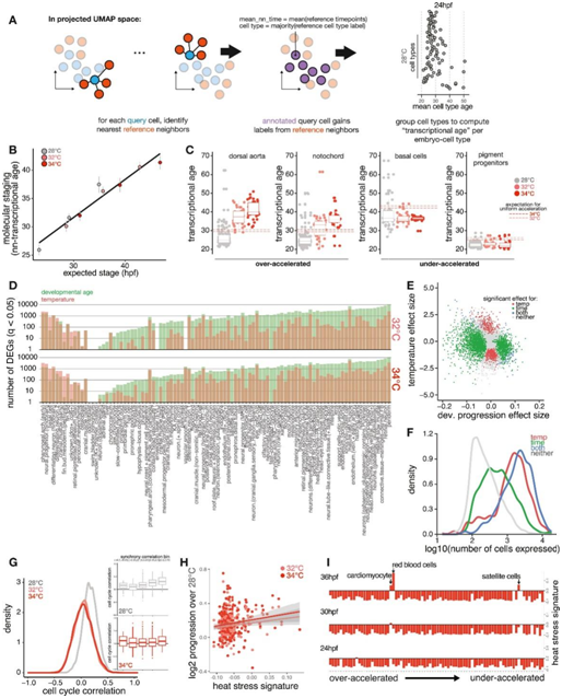 (A) 示意图显示通过参考中时间点标签的最近邻平均来计算每个细胞的转录年龄。(B)如图 2B所示的散点图,但显示了通过转录数据预测温度诱导的发育加速的效果。(C) 箱线图显示加速度大于预期(左)和加速度小于预期(右)的细胞类型的个别示例。(D) 条形图显示每种细胞类型中显著差异表达基因的数量。(E) 散点图显示特定细胞类型(脊索)受发育年龄和温度影响分开的重要基因。(F) 密度直方图显示与温度显著相关的基因往往表现出比发育年龄基因更高的表达水平。(G) 所有细胞类型对的细胞周期特征值的成对Pearson相关性的密度直方图,每个温度都有单独的密度。(H) 散点图显示每种细胞类型中 HSR 特征的基础水平并不是该细胞类型在 32°C 或 34°C 时发育加速的有力预测因子。(I) 条形图显示 34°C 下所有细胞类型的 HSR 特征诱导水平;y 轴上的细胞类型按相对发育加速度排序。