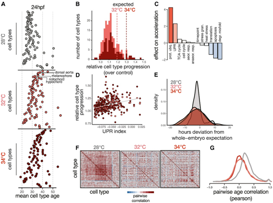 (A) 点图显示 24 hpf 时所有细胞类型的转录年龄,按温度划分。(B) 直方图显示每个温度下相对细胞类型进展的分布,垂直线显示整个胚胎预期的相对进展。(C) 条形图显示了在预测高温下细胞类型相对进展的加法模型中与代谢、蛋白质折叠、增殖和应激反应相关的几种细胞过程的表达水平的效应大小。(D) 散点图显示每种细胞类型中 UPR 的基础水平与其相对进展的关系,揭示了两种温度的正趋势。(E) 密度直方图显示在高温下培养的胚胎的发育阶段的差异增加。(F) 热图显示胚胎中所有细胞类型的转录年龄的成对相关系数;在 28°C 时,大多数细胞类型对在各个胚胎之间呈正相关,而这种相关结构在温度升高时会减弱。(G) 每个温度下成对相关值的密度直方图。