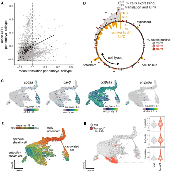 他们检测到脊索 UMAP 焦点区域高温条件下的细胞显著富集,包括上皮样鞘细胞中的“热点”,其表达翻译和 UPR 基因的水平高于其他脊索亚型(图 5 A)。上皮样鞘细胞的主要功能是产生、加工和包装大量胶原蛋白和细胞外基质蛋白,这些蛋白和细胞外基质蛋白最终分泌以产生细胞外脊索鞘,这对于脊索的刚性和适当的功能至关重要。