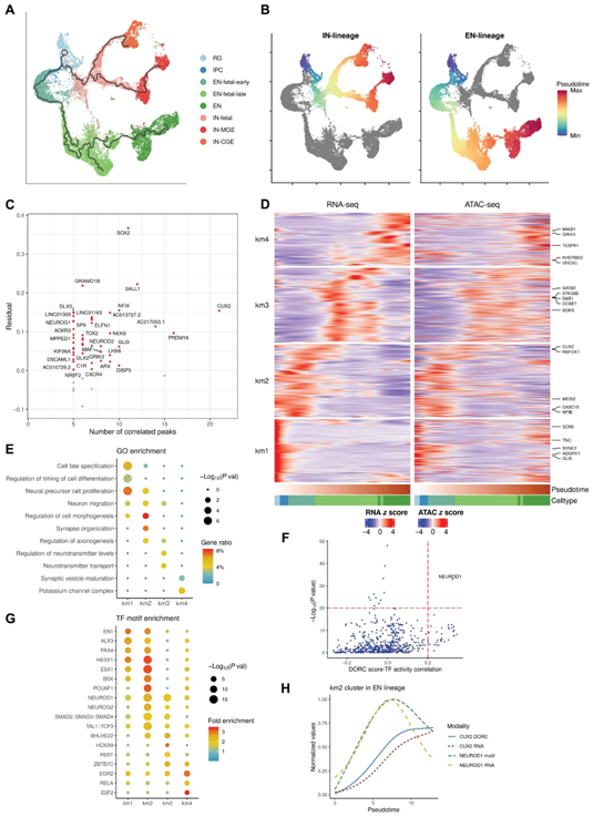 在鉴定了从早期胎儿皮质板到成人皮质样本的各种神经元亚型后,他们接下来使用配对的多组学单细胞核图谱来推断整个皮质发生和神经元分化过程中基因调控的发育动力学。通过关注神经元群体(包括 RG、IPC、EN-fetal-early、EN-fetal-late、EN、IN-fetal、IN-MGE 和 IN-CGE)并锚定起始点来进行伪时间轨迹分析。不同的细胞类型根据其发育阶段而拟合在推断的轨迹上(图3A),胎儿样本特异性神经元群体位于初始祖群体和出生后样本的成熟神经元之间(即EN、IN-MGE和IN-CGE)。在起始点后不久,发育轨迹分为EN谱系和IN谱系,IN谱系随后又分为IN-MGE和IN- CGE亚型(图3B)。分配给三种谱系的细胞数量分别为EN谱系(14146)、IN-MGE谱系(5728)和IN-CGE谱系(4904)。他们在神经元群体中重复了峰基因关联分析,得到了涉及930个独特基因的1638个显著关联。在整个谱系中,残差通常为正(图3C),这反映了顺式调控元件的谱系启动,因为DPRC通常在其相关基因表达开始之前就变得可及。此外,他们发现DORC的谱系启动模式随着峰值数量的增加而变得更加稳健,这表明对染色质可及性启动状态的置信度更高。