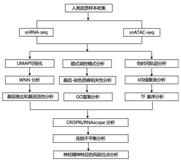 本项研究同时分析了从胎儿到成人的六个主要发育时间点的 45549 个皮质核的基因表达和染色质可及性,确定了细胞类型特定的区域,其中染色质可及性与基因表达高度相关。伪时间轨迹分析表明,CRE 处的染色质可及性先于转录,并且染色质结构的动态变化在神经元谱系定型中发挥着关键作用。此外,他们还分析了与神经精神特征(包括精神分裂症和双相情感障碍)有关的细胞类型特异性和时间特异性遗传位点。总之,本项研究结果描述了谱系决定的关键阶段细胞组成的复杂调节,并揭示了基因表达的时空变化对神经精神疾病的影响。
