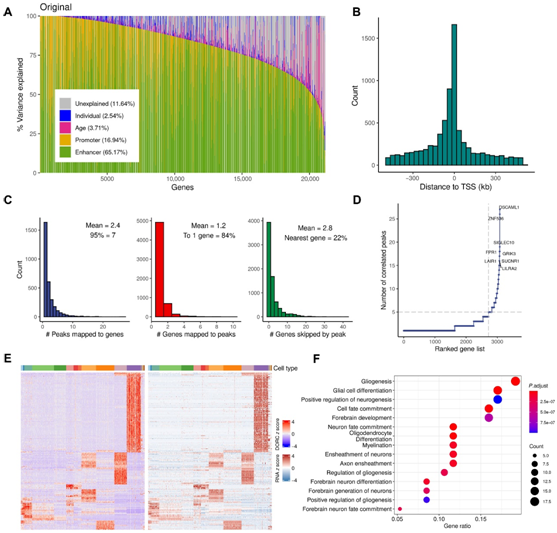 (A) 方差成分分析显示染色质可及性解释了基因表达的变化。(B) 每个峰到连锁基因 TSS 的距离分布。(C) 直方图显示(从左到右)每个基因显著相关的峰数量的分布。(D) 每个基因显著相关的峰数,基因按升序排序。(E) 热图显示 500 个伪bulk样本(列,按细胞类型排序)中 DORC 中关联峰-基因对的染色质可及性和基因表达(行,左:聚合峰可及性,右:关联基因表达)。(F) 与 DORC 相关的基因的前 15 个 GO 分析结果。