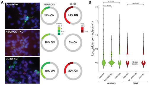 在阴性对照实验中,用乱序的引导 RNA (gRNA)处理细胞,观察到CUX2广泛表达,尽管每个细胞的mRNA数量较少,而NEUROD1的表达仅限于较小的细胞子集,但每个细胞的mRNA数量范围更广,包括显示强烈转录爆发的部分(图4A)。在分化后第2周,他们定量了两个基因的每个核内荧光点的频率分布,并发现在整个群体中(通过fano因子测量)NEUROD1的表达比CUX2的变化更大(图4B)。