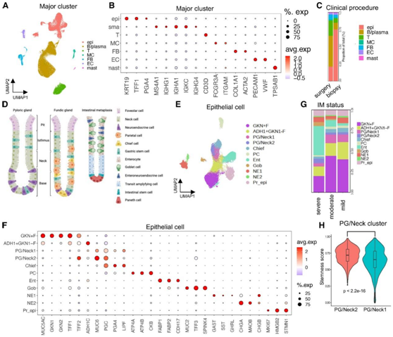 (A) UMAP 显示通过 scRNA-seq 鉴定的 7 种主要细胞类型。(B) 代表性的主要细胞标记基因。(C) 主要细胞类型的比例。(D) PG、胃底腺和化生黏膜的上皮细胞类型。(E) UMAP 显示通过 scRNA-seq 鉴定的上皮细胞亚聚类。(F) 代表性上皮细胞标记基因。(G) 根据肠化生状态的上皮细胞类型的比例。(H) PG/neck1 和 neck2 的干性评分。
