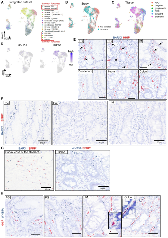 (A) FB 亚聚类基于胃 FB 和 肠FB细胞的组合数据集。(B-C) UMAP 中每个数据集的分布。(D) FB 中 BARX1 和 TRPA1 的表达。(E-H) RNA-ISH分析。