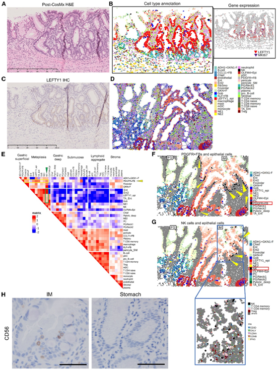 (A–C) 具有局灶性增殖特征的从胃到肠化生的代表性过渡黏膜。(D) 胃黏膜中的代表性空间网络。(E) 使用 (D) 中所示的空间网络的细胞邻近度得分热图。(F-G) Epi 细胞与 PDGFR +FB和NK细胞之间的接近度。(H) 胃黏膜和肌内黏膜上 CD56 的 免疫组织化学(IHC)。