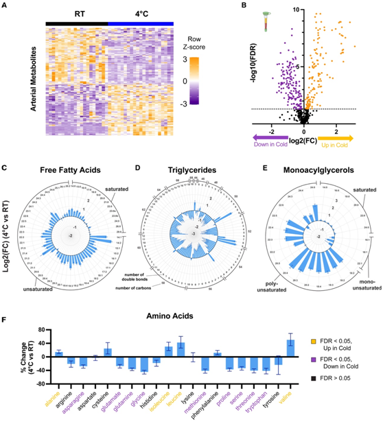(A) 差异丰度代谢物的热图。(B) 火山图比较 4°C 或 RT 下小鼠血浆代谢水平。(C–E) 与RT相比,4°C 下小鼠血浆中个体游离脂肪酸、甘油三酯和单酰甘油的变化。(F) 与 RT 相比,4°C 下小鼠血浆中单个氨基酸的百分比变化。