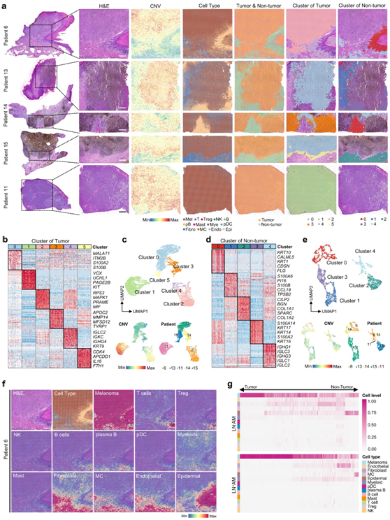 他们通过空间转录组分析(ST-seq)获得了3例LN+AM患者和2例LN-AM患者的原位基因表达谱。使用基于条件自回归的反卷积(CARD)算法将斑点划分为肿瘤区和非肿瘤区(图2a)。在肿瘤区域,他们区分了CNV水平显著差异的6个聚类,这些聚类构成了不同患者的斑点。例如,患者6与聚类2和聚类4相关,而患者11与聚类1相关,且CNV水平最高(图2b-c)。在非肿瘤区域,鉴别出5个聚类,患者6、11、14和15共有第4聚类(图2d-e),这些结果表明肿瘤区域具有高度的肿瘤间异质性。