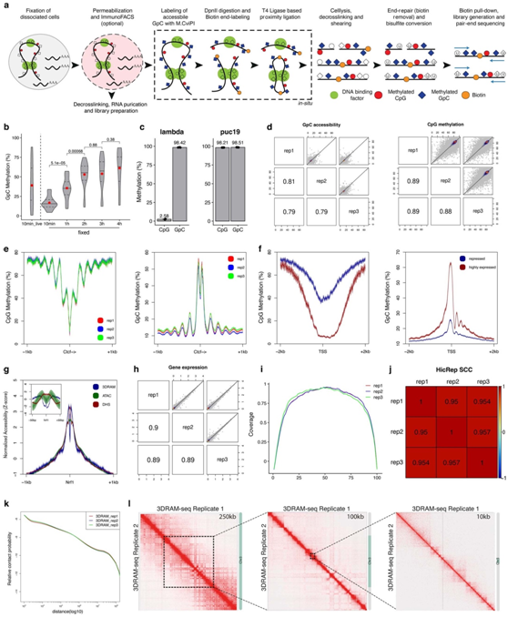 (A) 3DRAM-seq 实验流程。(B) 显示GpC 甲基化水平的小提琴图。(C) 显示lambda 甲基化水平(仅 GpC 甲基化)和完全甲基化 puc19 DNA 标记对照的条形图。(D) 成对相关矩阵显示 Pearson 相关系数以及 1 kb bin 中 GpC 可及性和 DNA 甲基化的散点图。(E) 单个重复的以基序为中心的 Ctcf ChIP-seq 峰的平均 CpG 甲基化和 GpC 可及性水平。(F) 以 TSS 为中心的抑制基因或高表达基因的平均 CpG 甲基化和 GpC 可及性水平。(G) 以基序为中心的 Nrf1 ChIP-seq 峰(2 bp bin)的平均可及性水平。(H) 显示相关系数 (Spearman) 的成对相关矩阵,以及基因表达的散点图。 (I) 由 RSeQC 计算的管家基因中每次重复的 RNA-seq 读取覆盖率。 (J) 显示 3D 基因组相关系数的成对相关矩阵(层调整相关系数,10 kb bins,由 HiCRep 计算)。 (K) 对数箱中的接触概率。 (L)重复 1 和 2 的 3 号染色体接触图。