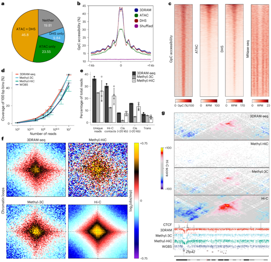 (a) 饼图描绘了 3DRAM-seq GpC 可及峰仅与 ATAC-seq 峰重叠、仅与 DHS 峰重叠、与 ATAC 和 DHS 重叠或两者都不重叠的百分比。(b) 3DRAM-seq GpC-seq、ATAC-seq、DHS-seq 或混合区域(5 bp bin)的平均 GpC 可及性水平。(c) 热图显示通过 GpC 甲基化、ATAC-seq、DHS以及核小体占用(MNase-seq)的可及性数据。(d) 不同方法的覆盖率比较。(e) 3DRAM-seq、Mmethyl-3C 和 Mmethyl-HiC 的测序统计。 (f) 使用 HICCUP 5 kb 分辨率在原位 Hi-C 数据。(g) 不同方法的接触图和 DNA 甲基化模式的比较,以及 CTCF ChIP-seq 轨迹。