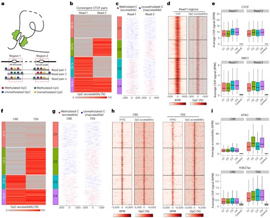 (a) 单分子共可及性测定的示意图。 (b) 以至少 1 kb 间隔的会聚 CTCF 基序为中心的 100 bp 窗口中的聚类平均配对共可及性水平。(c) 与(b)相同,但显示每次读取中各个 GpC 二核苷酸的甲基化状态。(d) 对于包含 CTCF 正向基序的相同 read 1 区域,±500 bp 窗口中的平均 CTCF ChIP-seq 信号和 GpC 可及性水平。(e) 箱线图显示 CTCF 或 SMC1的ChIP-seq 信号。(f-g) 与b和c相同,但对于读取 1 上包含 CRE(定义为远端开放彩色区域)和读取 2 上包含 TSS 的读取对。(i) 箱线图在以 CRE 或 TSS 为中心的 ±250 bp 窗口中显示 ATAC-seq 和 H3K27ac ChIP-seq 信号。