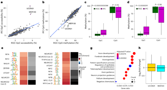 为了研究转座元件 (TE) 对人类大脑发育中表观遗传重组的贡献,他们首先关注染色质循环。接下来,他们确定了两类te:MER130和UCON31,它们在ipc中更可及(图6a-d)。然而,这两类TE总体上仍然高度甲基化(图6b-d),这表明这两种模式存在部分解偶联效应。为了确定调节这两个 TE 类别的因子,他们进行了基序分析,发现神经源性 TF 大量富集,例如 NEUROG2、NFIA 和 NFIX,这些神经源性 TF 与 IPC 分化有关(图6e-f)。他们发现与神经元分化和成熟或大脑发育相关的通路显著富集(图6g),但没有证据表明存在差异基因表达(图6h)。