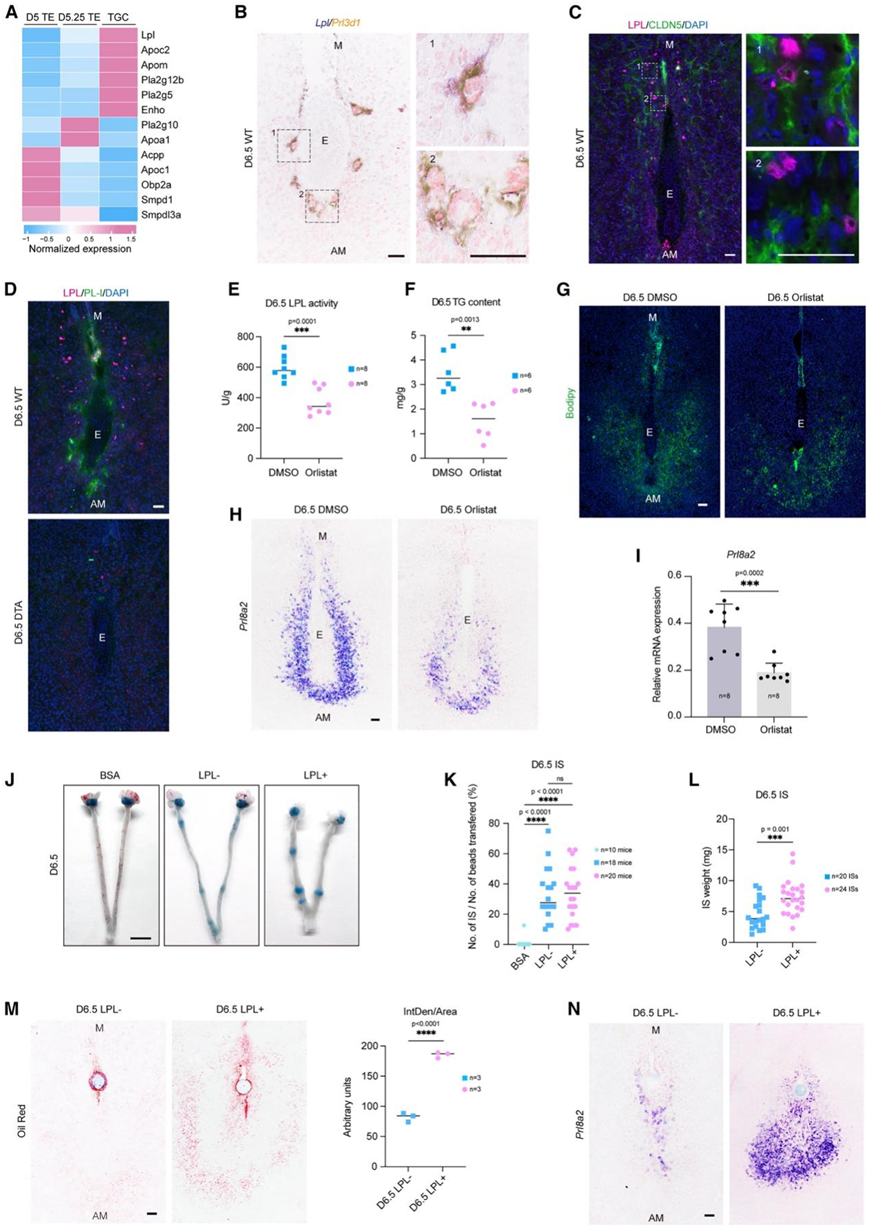 (A)脂质代谢的分泌蛋白的基因热图。(B) 6.5 天 WT 子宫中Lpl和Prl3d1 mRNA的双原位杂交。(C) 6.5 天 WT 子宫中 LPL 和 CLDN5 的联合免疫荧光染色。(D) 第 6.5 天 WT 和 DTA 子宫中 LPL 和 PL-I 的联合免疫荧光染色。(E-F)通过分光光度计测定LPL活性和TG含量测定。(G-H) 注射 DMSO 和奥利司他后第 6.5 天 WT 小鼠子宫内脂滴的 Bodipy 荧光染色和Prl8a2 mRNA 的原位杂交。(I)实时qPCR分析。(J) 代表性子宫图像。(K)珠子转移测试的定量结果。(L) 第 6.5 天 LPL− 和 LPL+ 珠诱导的 IS 的重量比较。(M) 用 LPL− 和 LPL+ 珠子对子宫中的脂滴进行油红 O 染色(左)。计算油红O染色的积分密度/面积值以量化灰度值(右)。(N) (M) 的相邻图像。
