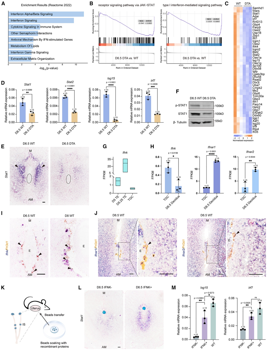 (A)通路富集分析。(B)GSEA分析。(C) 第 6.5 天 DTA 与 WT 子宫中下调的 IFN 反应基因。(D)通过实时qPCR分析验证第6.5天WT和DTA子宫中Stat1、Stat2、Isg15和Irf7相对表达水平。(E)第 6.5 天 WT 和 DTA 蜕膜中Stat1 mRNA的原位杂交。(F) 第 6.5 天 WT 和 DTA 子宫中 p-STAT1 和 STAT1 的免疫印迹分析。(G-H)每百万映射片段中每千碱基转录本的片段(FPKM)值。(I) WT 妊娠子宫第 6.5 天和第 8 天的Ifnk和Prl3d1 mRNA 双原位杂交。(J) WT 6.5 天妊娠子宫中Ifnar1和Prl3d1 mRNA(带放大图像)以及Ifnar2和Prl3d1 mRNA(带放大图像)的双原位杂交图像。(K)示意图。(L)通过原位杂交检查第 6.5 天小鼠的蜕膜瘤中的Stat1 mRNA 表达。(M) 在第 6.5 天对 IFNK− 和 IFNK+ 蜕膜和 WT 蜕膜中的Isg15 和 Irf7相对表达水平进行实时 qPCR 分析。