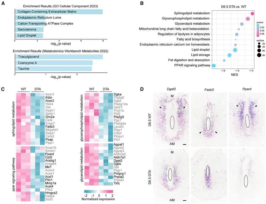 (A)通路富集分析。(B) GSEA 气泡图显示与 WT 相比,第 6.5 天 DTA 中与脂质代谢生物学效应相关的基因的富集。(C) 第 6.5 天 DTA 与 WT 中与鞘脂代谢、PPAR 信号通路、GP 代谢和 GL 代谢相关的代表性下调基因的热图。(D)第 6.5 天 WT 和 DTA 蜕膜中Dgat2、Fads3和Ppard mRNA的原位杂交,表明这些基因的区域化表达。