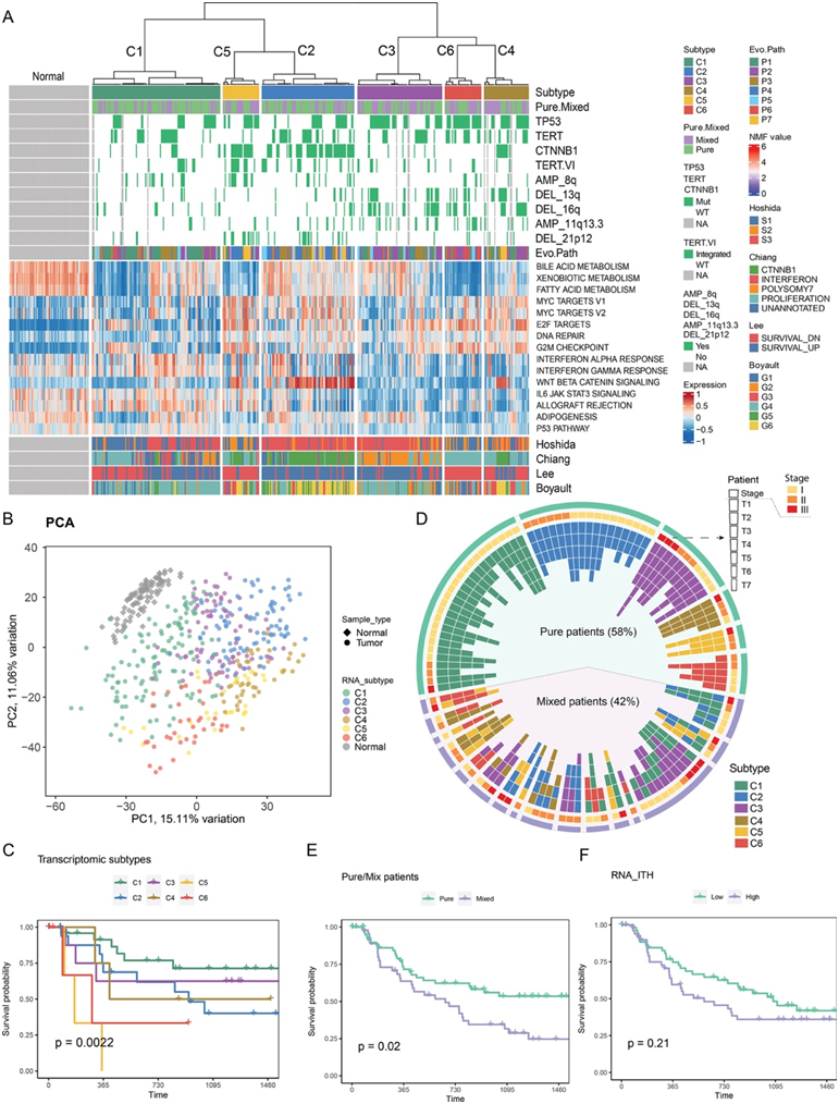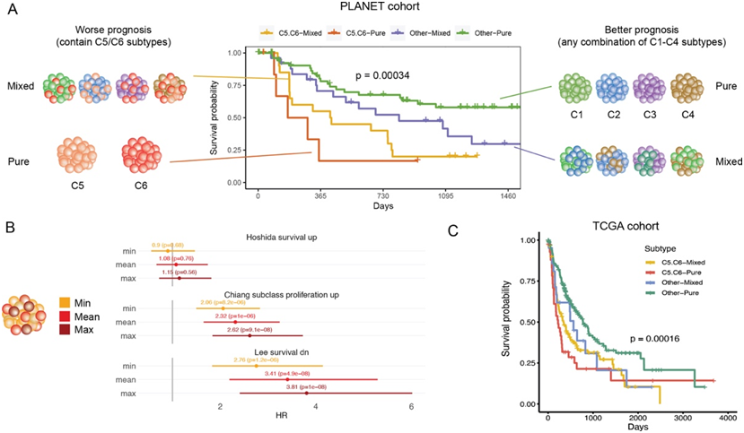 他们进一步通过TCGA的外部队列验证了“坏苹果”效应。使用一种称为WISP的转录组反卷积方法,将每个单节段的TCGA HCC肿瘤解卷积到基于每个转录组亚型质心的转录组分类中,并根据反卷积权重将其分类为纯样本或混合样本。与在PLANet队列中发现的“坏苹果”效应一致,在TCGA队列中,包含C5或C6亚型的患者——无论是纯形式还是混合形式——都表现出比更差的无复发生存期(图4C)。