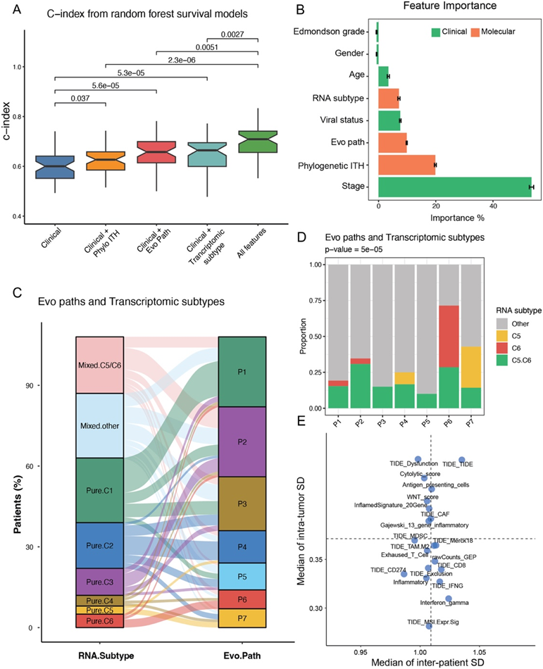 (A) 不同特征组合的一致性指数 (c 指数) 分布。(B) 特征重要性得分的排序。(C) 冲积图显示属于不同转录组亚型的进化亚型的比例。(D) 每种进化亚型中 C5 和 C6 纯或混合患者的比例。(E) 不同免疫检查点阻断 (ICB) 生物标志物的患者间和肿瘤内标准差 (SD)。