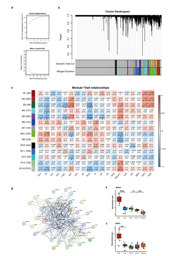 (a) 最佳β值的确定。(b)在血液中构建加权基因共表达网络。(c)与19种血液生物指标相关的基因模块(M1-M14)。(d)蛋白质-蛋白质相互作用网络。(e-f)基因模块3(M3)的基因样例。