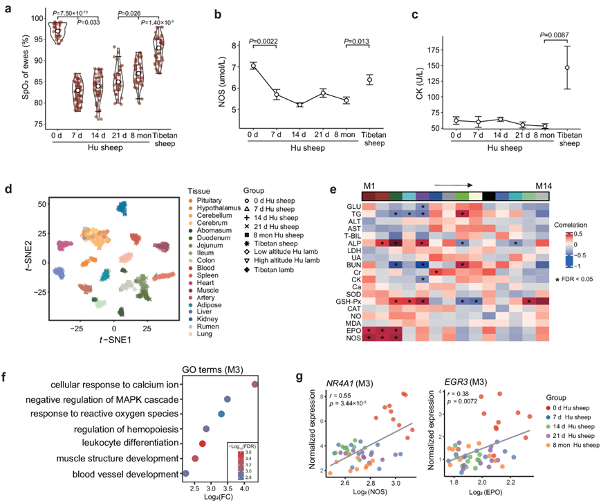 (a) 血氧饱和度(SpO2)随适应时间的变化。(b-c) 一氧化氮合成酶(NOS)和心脏酶(CK)值随时间的变化。 (d) RNA-Seq 样本的t分布随机邻域嵌入 (t-SNE) 聚类。(e) 血液中基因模块和生物指标之间的关联。(f)GO分析 (g) M3中的基因示例。