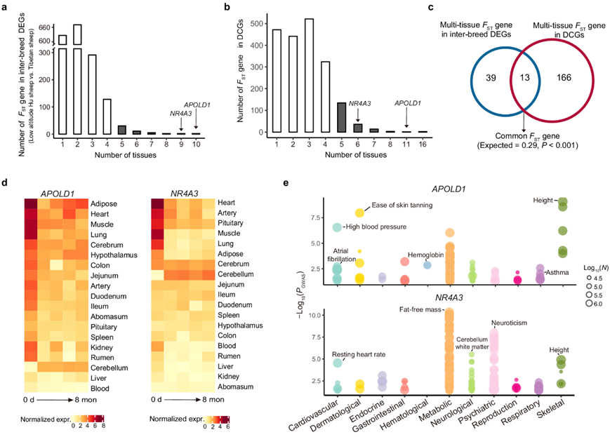 (a) FST基因在不同品种(即低海拔湖羊与藏羊)间组织差异表达基因(deg)中的分布 (b) FST基因在DCG组织中的分布。(c) 维恩图显示了杂交deg和dcg中多组织FST基因的交集。(d) APOLD1(左)和NR4A3(右)随时间在各组织中的表达变化。(e) APOLD1(上)和NR4A3(下)的全表型关联分析(Phe-WAS)。
