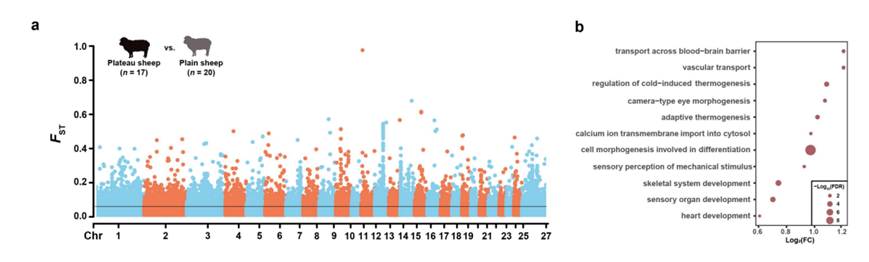 (a)低海拔和高海拔绵羊FST值的全基因组分布。(b)GO分析。