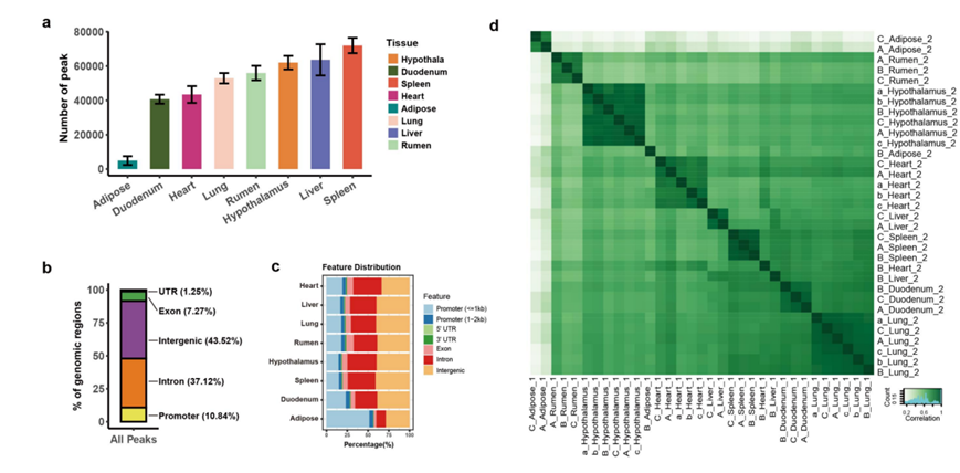 (a) 组织中峰的数量。(b) 峰在基因组区域的总体分布。(c)峰基因组区在组织中的分布。(d)基于平均峰密度的所有ATAC-seq数据之间的Pearson相关性。