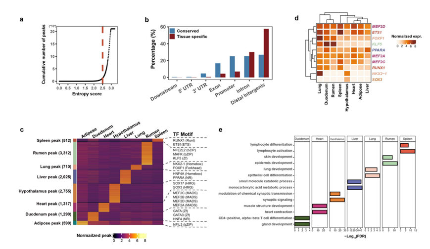 (a)基于Shannon熵评分的组织特异性峰的识别。(b)基因组区域中保守峰和组织特异性峰的分布。(c)热图显示了组织特异性峰的信号密度,以及每个组织的代表性转录因子(TF)基序。(d)热图显示TF靶基因在组织中的表达。(e)在整个组织中富集组织特异性峰连锁基因。