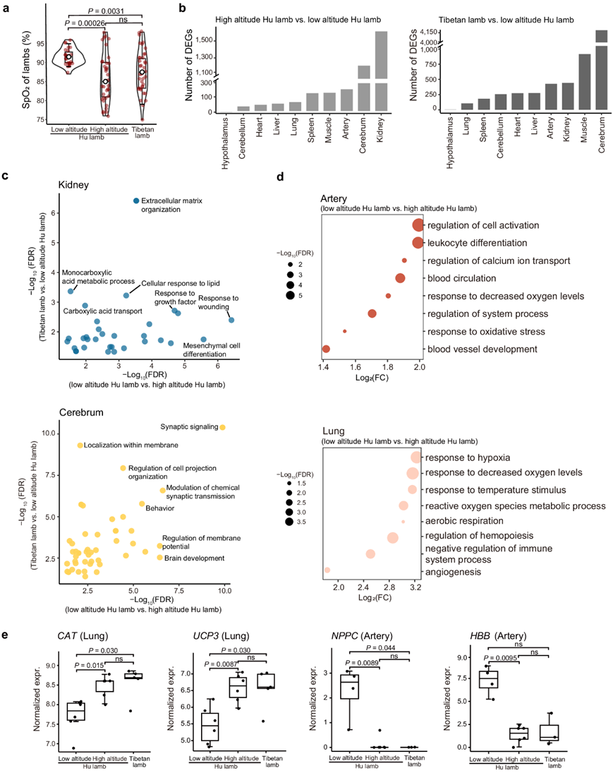 (a) 三组羔羊的SpO2变化。(b) DEG 数量分析。(c-d)GO分析。(e) 关键基因的表达水平分析。