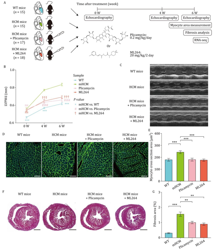 (A)显示普卡霉素或ML264注射HCM小鼠的实验过程。(B) 折线图显示了超声心动图对WT小鼠(蓝线)和HCM小鼠LVPWd厚度随时间的变化。(C) 左心室短轴乳头肌切片m型超声心动图的代表性照片。(D) 代表性图像左心室肌切片染色小麦胚芽凝集素(WGA)测量心肌细胞的大小。(E) 条形图显示了基于WGA染色的指示组肌细胞横截面积的定量。(F) 四组心脏切片代表性Masson三色染色图像检测纤维化。