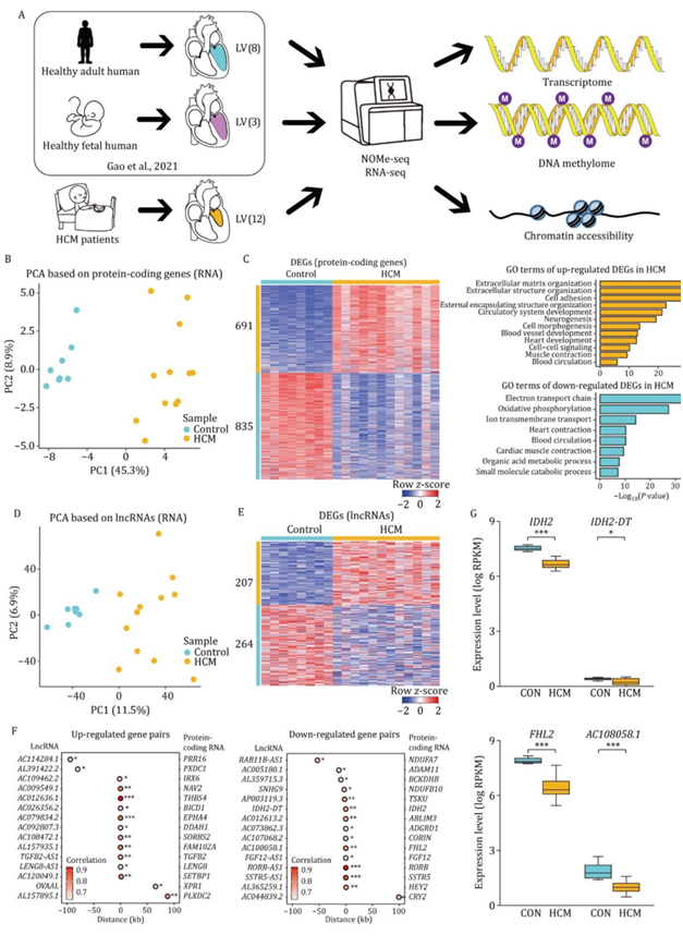 为探讨HCM的病理机制,研究者团队收集HCM患者心肌进行多组学分析。他们进行了核小体占据和甲基化组测序(NOMe-seq)来分析表观基因组学,包括DNA甲基组和染色质可及性,并进行了转录组分析(RNA-seq)(图1A)。首先,他们研究了HCM的转录组变化。基于蛋白质编码基因的主成分分析(PCA)清晰地将HCM患者与成人对照区分开(图1B)。他们鉴定了两组之间的差异表达基因(DEG)。在HCM患者中,共有691个基因表达上调,这些基因在多种通路中富集,包括细胞外基质组织、细胞外结构组织、细胞粘附和循环系统发育。在HCM患者中,共有835个deg发生下调,这些deg在多种通路富集,包括电子传递链、氧化磷酸化、心脏收缩和代谢过程(图1C)。DEG的上调主要反映了HCM心肌细胞外基质蛋白的激活和过度积累。下调的deg主要参与代谢信号紊乱,这表明HCM是一种心脏能量学改变的疾病。长链非编码rna (lncRNA)也是心脏发育和稳态的重要调节因子。仅使用lncrna的PCA也成功地将HCM患者与成人对照分开(图1D)。在HCM中共鉴定出207个差异表达上调的lncrna和264个差异表达下调的lncrna(图1E)。然后,他们检测了蛋白编码基因与lncrna表达之间的相关性,以确定潜在的顺式调控,发现15对基因上调和15对基因下调(图1F)。在这些基因对中,IDH2在防止小鼠心脏肥大的氧化应激中发挥作用,FHL2可抑制病理性心脏重塑(图1G)。