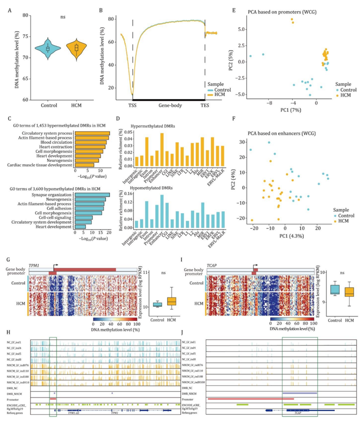 接下来,他们研究了HCM心肌中DNA甲基化的变化。HCM患者和对照组的总DNA甲基化水平相似(图2A)。HCM患者和对照组之间基因体周围和侧翼区域的平均DNA甲基化水平分布几乎重叠(图2B)。PCA提示HCM患者与对照组DNA甲基化组存在差异。然后,他们使用甲基化水平差异20%的严格标准确定HCM患者和对照组之间的差异甲基化区域(DMR)。在HCM患者中共鉴定出1453个高甲基化DMR,与这些DMR相关的基因在肌动蛋白丝基过程、血液循环和心脏收缩中富集。HCM患者中共有3600个DMR低甲基化,相关基因在突触组织、细胞粘附和细胞-细胞信号传导中富集(图2C)。高甲基化和低甲基化的DMR都富集在外显子、启动子和增强子区域(图2D)。
