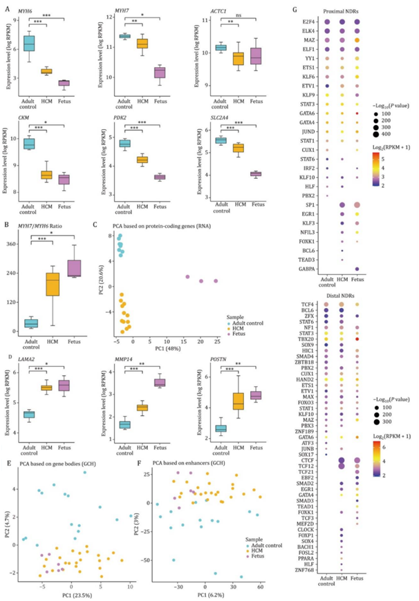 (A) 箱形图显示MYH6、MHY7、ACTC1、CKM、PDK2和SLC2A4在成人对照、HCM患者和胎儿中的表达水平。(B) 箱线图显示三组MYH7/MYH6比值。(C) PCA图显示了成人对照、HCM患者和胎儿中蛋白质编码基因的转录组模式。(D) 箱形图显示LAMA2、MMP14和POSTN在成人对照、HCM患者和胎儿中的表达水平。(E) PCA图显示成人对照、HCM患者和胎儿基因体的染色质可及性模式。(F) PCA图显示了三组增强子的染色质可及性模式。 (G) 成人对照、HCM患者和胎儿NDR近端(上)和远端(下)基序富集分析。