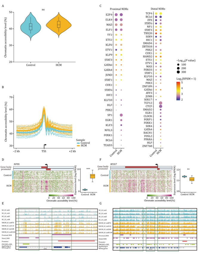 (A) 小提琴图显示HCM患者和健康成人对照全基因组的总可及性水平。(B) 线形图显示HCM患者和对照组TSS上游和下游2kb区域的平均染色质可及性水平。(C) HCM患者和健康成人对照近端(左)和远端(右)NDR的基序富集分析。(D) 热图显示所有HCM患者和对照组NPPA基因体±10kb区域的染色质可及性水平。(E) IGV图像显示了4例HCM患者和4例对照组的NPPA及其邻近区域的染色质可及性水平。(F) 热图显示了基因体±10kb区域的染色质可及性水平(左),箱线图显示了所有HCM患者和对照组中MYH7的基因表达水平(右)。(G) IGV图像显示4名HCM患者和4名对照者MYH7及其邻近区域的染色质可及性水平。