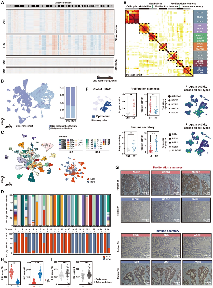 (A) 热图显示代表性患者(LCC 为 C125,RCC 为 C109)个体细胞大规模 CNV 的染色体图。(B) 84975 个上皮细胞的 UMAP 图,按恶性和非恶性细胞着色。(C) 恶性上皮细胞聚类的 UMAP 图,按患者(左)或癌症类型(右)着色。(D) 堆叠直方图显示每个恶性上皮聚类的患者比例(上)或癌症类型(下),按患者或癌症类型着色。(E)热图描绘了所有患者共有的表达元程序。(F) 恶性上皮中的 PS 和 IS 元程序在左侧和右侧结肠癌中的活性有显著差异。(G) 验证队列 5 中 PS(上)和 IS下元程序的特征基因产生的蛋白质的代表性免疫组织化学 (IHC) 染色。(H) 左侧肿瘤(LT)和 右侧肿瘤(RT)之间 PS 和 IS 特征基因表达的 H 分数。(I) 早期和晚期结肠肿瘤组织中 PS 和 IS 染色评分的分布。
