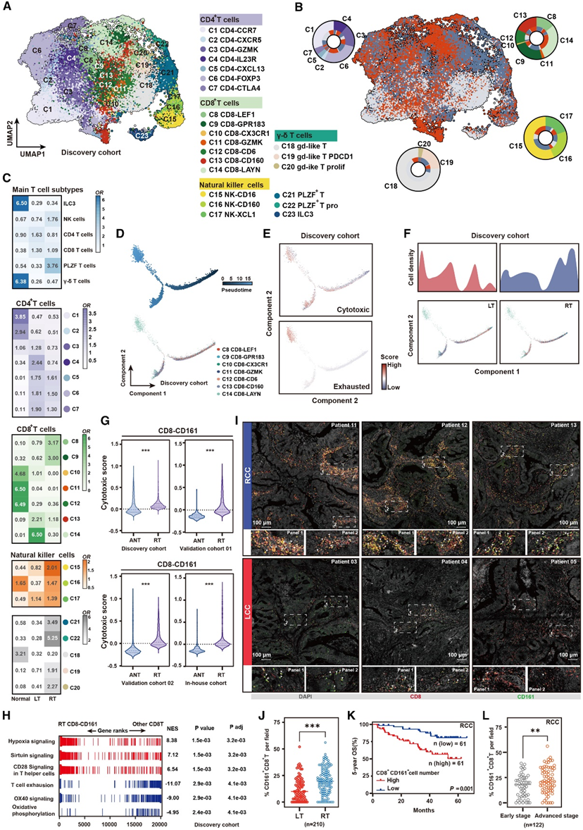 (A)T 细胞的 UMAP 图。(B)按样本类型(正常、LT 或 RT)着色的 UMAP 图。(C) 热图显示每个组织中出现的 T 细胞亚群的 OR。(D)CD8 + T 细胞的伪时间分析。(E) 2D 伪时间图显示 LT 和 RT 样本中 CD8 + T 细胞的细胞毒性或耗竭信号的动态。(F) LT(左图)和 RT(右图)样本中伪时间排序的 CD8 + T 细胞的 2D 图。(G) 小提琴图显示来自邻近正常组织和RT样本的 CD8-CD161 细胞的细胞毒性评分。(H)与 RT 中的其他 T 亚群相比,CD8-CD161 细胞中的基因组的 GSEA 富集。(I)LT 和 RT 中 CD161 + CD8 + T 细胞的代表性 mIHC 染色(验证队列 5)。(J)根据 mIHC 染色结果显示左侧和右侧结肠肿瘤中CD161 + CD8 + T 细胞的密度的散点图。(K) 按 CD161 + CD8 + T 细胞浸润分层的 RCC 患者的 Kaplan-Meier OS 曲线。(L)早期和晚期 RCC 患者肿瘤切片中CD161 + CD8 + T 细胞的密度。